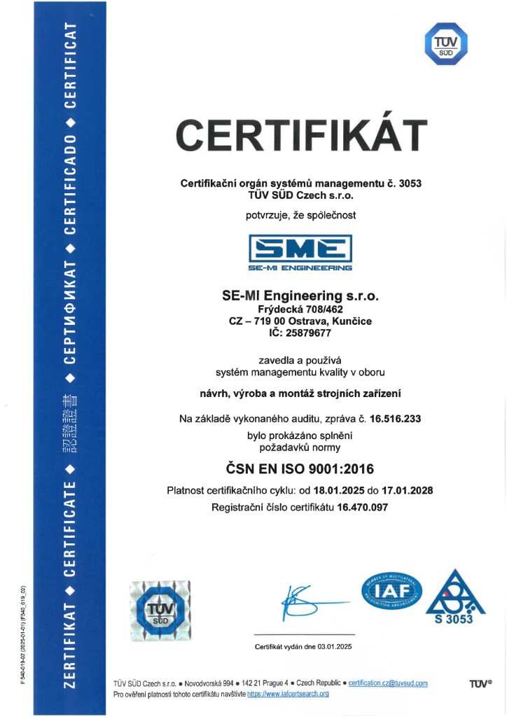 Jsme spolehlivým dodavatelem kompletních řešení pro průmysl s více než dvacetiletou tradicí. To, co nás odlišuje, je náš komplexní přístup a závazek ke kvalitě, který začíná již u prvního návrhu. Všechny stroje, zařízení a výrobní linky navrhujeme a vyrábíme sami na základě vlastní konstrukční dokumentace.